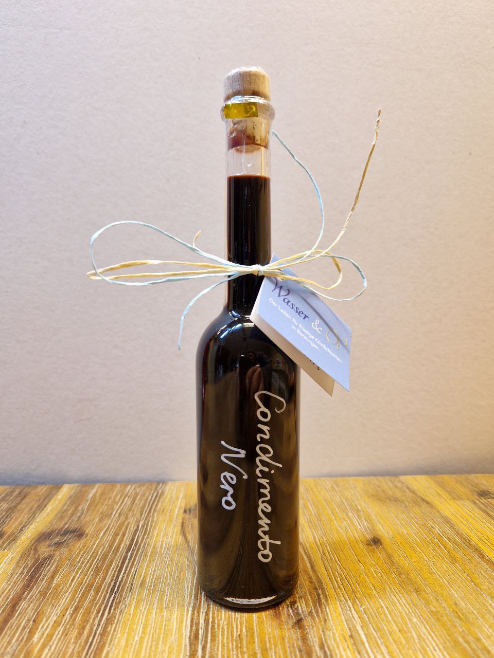 Der Condimento Nero ist ein dunkler, milder Essig auf Basis von eingekochtem Traubenmost – ganz ohne Zuckerzusatz. Mit einer Säure von nur mindestens 4,3 % ist er besonders bekömmlich und angenehm rund im Geschmack.